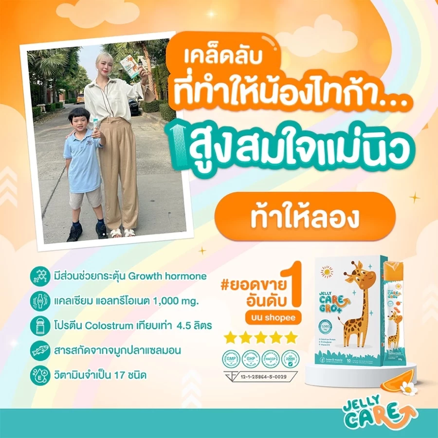 Jelly CARE GRO+ เจลลี่แคร์ โกร พลัส เจลลี่แคลเซียม 1,000 mg เพิ่มความสูงเด็ก บำรุงสมอง 🔥 บริการส่งไวมาก ! เก็บเงินปลายทางได้ พร้อมให้คำปรึกษาจากผู้เชี่ยวชาญ ก่อน-หลังการขายเต็มที่ เพื่อให้คุณน้องๆ หนูๆ สูงขึ้นและแข็งแรงสมวัย 💞 💞 เจลลี่วิตามินเด็ก สูตรคุณหมอที่พ่อแม่เลือก 💞 รสส้มแมนดาริน สารอาหารนำเข้าจาก USA และ Germany 💞 โดยเฉพาะน้องๆ หนูๆ ที่ทานยาก ไม่ค่อยทานข้าว 💞 ให้น้องๆ ได้รับสารอาหารที่จำเป็นต่อการเจริญเติบโตในทุกวัน 💞 แนะนำเลยค่ะ ทุกคนพูดเป็นเสียงเดียวกันว่าอร่อยมาก ทานง่าย 💞 ดูแลครบ จบใน 1 ซอง 🍊 1 กล่อง บรรจุ 10 ซอง 🍊 เจลลี่เพิ่มความสูง Jelly CARE GRO+ ใครทานได้บ้าง? ✅ เหมาะกับเด็กอายุ 2 ขวบขึ้นไป สามารถทานช่วงเวลาใดก็ได้ ✅ อายุ 2-9 ปี แนะนำให้ทาน วันละ 1-2 ซอง ✅ อายุ 9-15 ปี แนะนำให้ทาน วันละ 2-3 ซอง Jelly CARE GRO+ (เจลลี่แคร์ โกร พลัส) คือ เจลลี่วิตามินผลิตภัณฑ์เสริมอาหารที่มีส่วนช่วยเสริมสร้าง Growth hormone และการเรียนรู้สำหรับเด็กวัยเจริญเติบโต คิดค้นสูตรโดยทีมแพทย์ เภสัชกร และนักโภชนาการ ด้วยสารสกัดหลักพรีเมียม 17 ชนิด ได้แก่ 1. Calcium L-Threonate 1,000 mg : แคลเซียมแอลทรีโอเนตเป็นแคลเซียมแบบ Vegan ดูดซึมได้เกือบ 100% ไม่ทำให้ท้องผูก ไม่ตกค้าง พร้อมความสามารถในการดูดซึมที่มากกว่าแคลเซียมอื่นถึง 8 เท่า ทำให้เป็นแคลเซียมที่เหมาะสำหรับเด็ก ✅ มีส่วนช่วยกระตุ้นเซลล์สร้างกระดูก ✅ ช่วยในกระบวนการสังเคราะห์คอลลาเจน (Collagen) ที่ช่วยเพิ่มความแข็งแรงของกระดูก ✅ ปริมาณแคลเซียมเทียบเท่าผักโขม 1 ชามใหญ่ 2. Colostrum Protein 180 mg สูงที่สุดในท้องตลาด : เป็นแอคทีฟโปรตีนสกัดจากโคลอสตรุ้ม หรือ "น้ำนมแรก" (Colostrum) ตัวช่วยสำหรับเพิ่มการสร้างกระดูก เทียบเท่า Colostrum 4.5 ลิตร ✅ เพิ่มการดูดซึมแคลเซียมเข้าสู่กระดูก ✅ เพิ่มการทำงาน เซลล์สร้างกระดูก (Osteoblast activation) ✅ ชะลอการทำงาน เซลล์สลายกระดูก (Osteoclast inactivation) ✅ ช่วยให้กระดูกยืดขยายได้เร็วขึ้นในวัยเจริญเติบโต ทำให้สูงเร็วขึ้น 3. Proteoglycan-S (สารสกัดจากกระดูกอ่อนจมูกปลาแซลมอน) : ความสูงที่สมบูรณ์แบบไม่ใช่แค่กระดูกที่แข็งแรง แต่ยังรวมถึงกระดูกอ่อน และข้อต่อด้วย ✅ โปรตีโอไกลแคน เป็นส่วนสำคัญในการสร้างคอลลาเจนชนิดที่ 2 (Collagen type 2) ซึ่งเป็นองค์ประกอบหลักของกระดูกอ่อน 4. กรดอะมิโนจำเป็น : L-Arginine, L-Lysine, L-Glutamine มีส่วนสำคัญในกระบวนการผลิตฮอร์โมนการเจริญเติบโตในวัยเด็ก ✅ โดยเฉพาะกรดอะมิโน L-Arginine, L-Lysine ที่ร่างกายไม่สามารถสังเคราะห์ได้เอง ต้องได้รับจากอาหารเท่านั้น 5. Vitamin D3 + K2 รูปแบบพร้อมดูดซึมและใช้งานได้ทันที โดยวิตามินเค 2 ช่วยป้องกันโรคหลอดเลือดหัวใจ ✅ บำรุงกระดูกและหัวใจ ✅ เสริมสร้างภูมิคุ้มกัน ✅ เจลลี่แคร์ 1 ซอง มีทั้ง